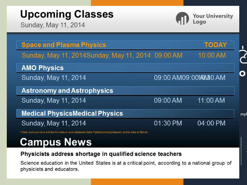 Design your screen with Videos, Images, RSS, Text, Clocks, Tabular data and much more.